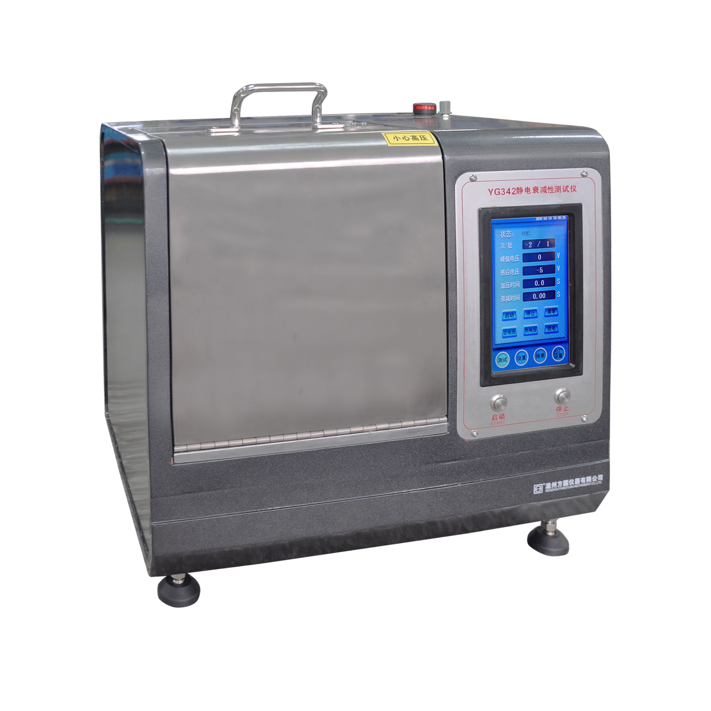 用途:用于測試醫(yī)用防護(hù)服材料和無紡布在施加±5000V電壓作用后停止充電,在接地的時候材料能夠消除誘導(dǎo)到材料表面的電荷的能力,即測定由峰值電壓衰減到10%的靜電衰減時間。